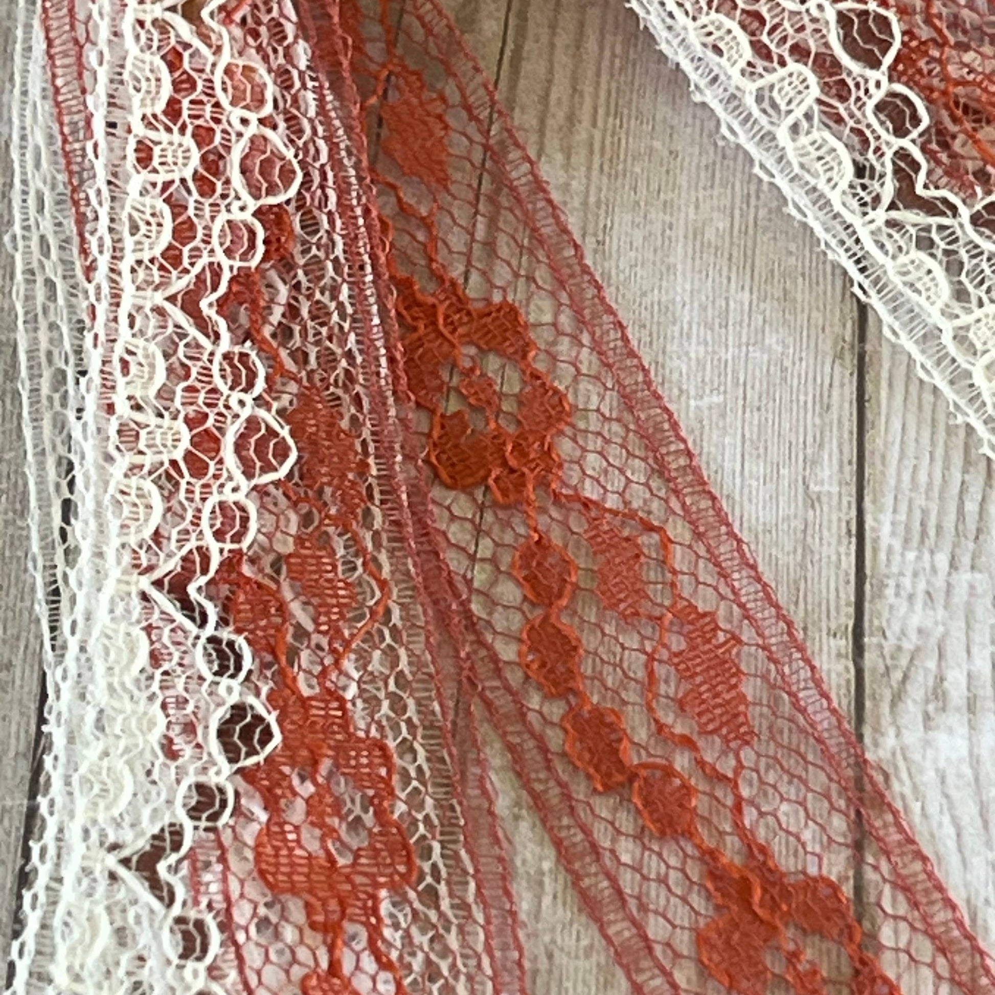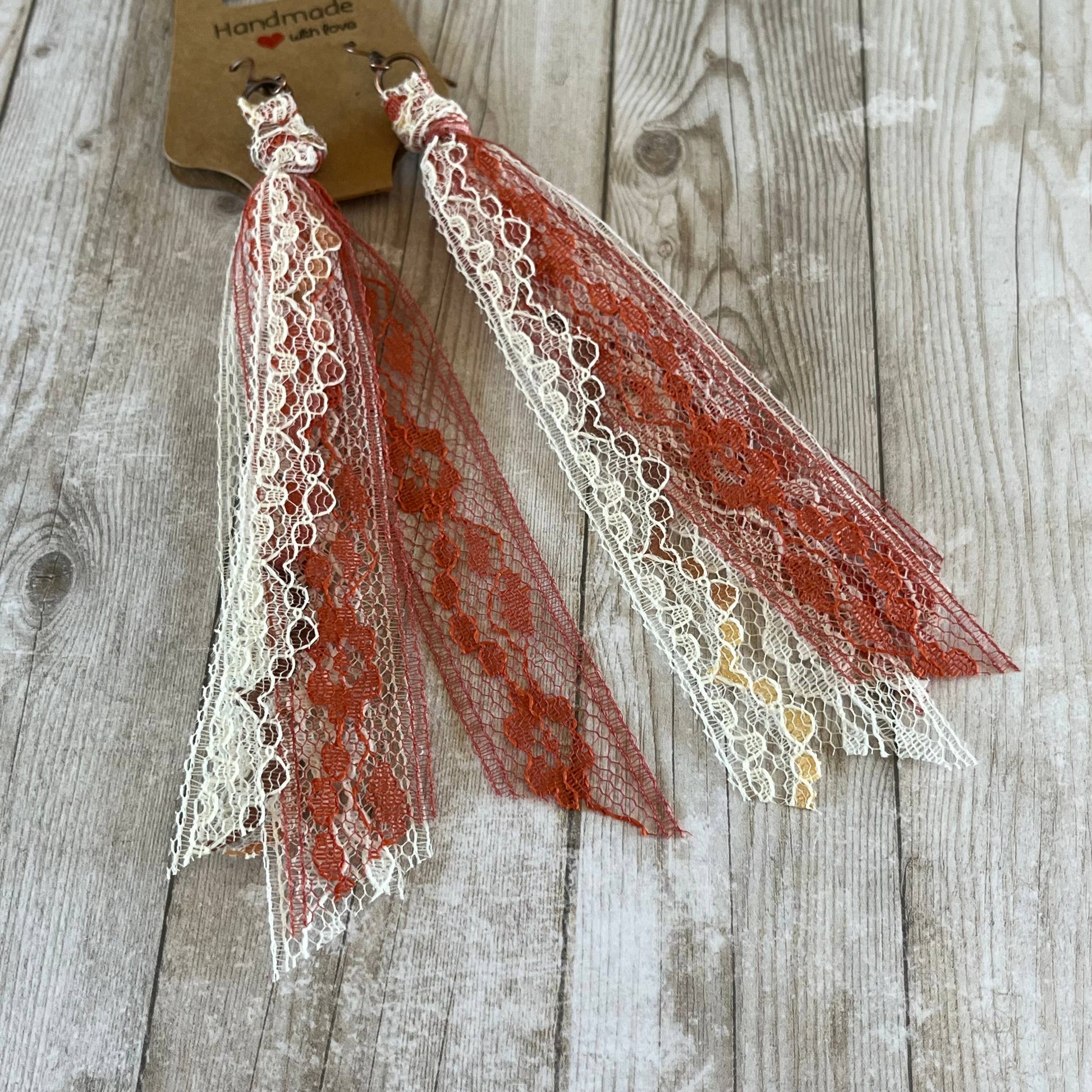 Get ready for Fall with these stunning earrings. The Autumn Rust blend features multicolor fall, Ivory, and rust vintage lace. Lace tassel measures 5 inches long. Hypoallergenic copper tone ear wires. Comes on a display card. Handmade in the USA.