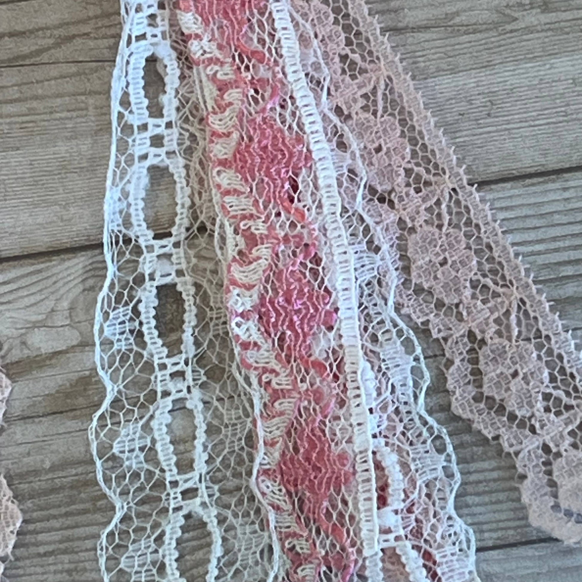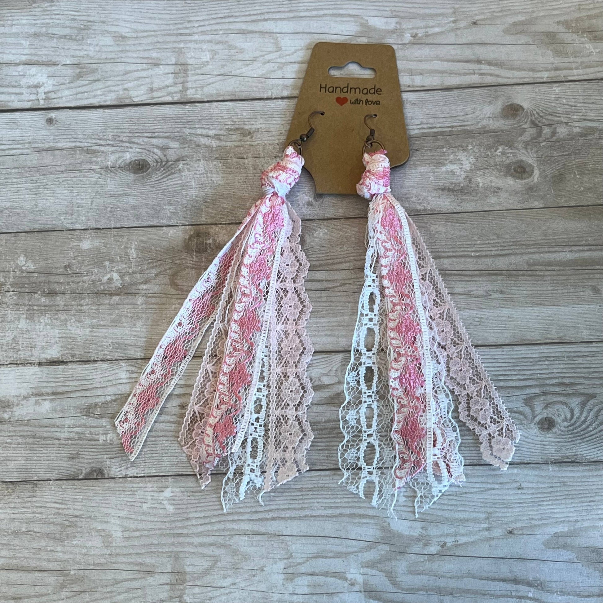 Handcrafted from light pink, white, and pink and white floral patterned vintage lace. Fun to wear, big earrings that are light weight.