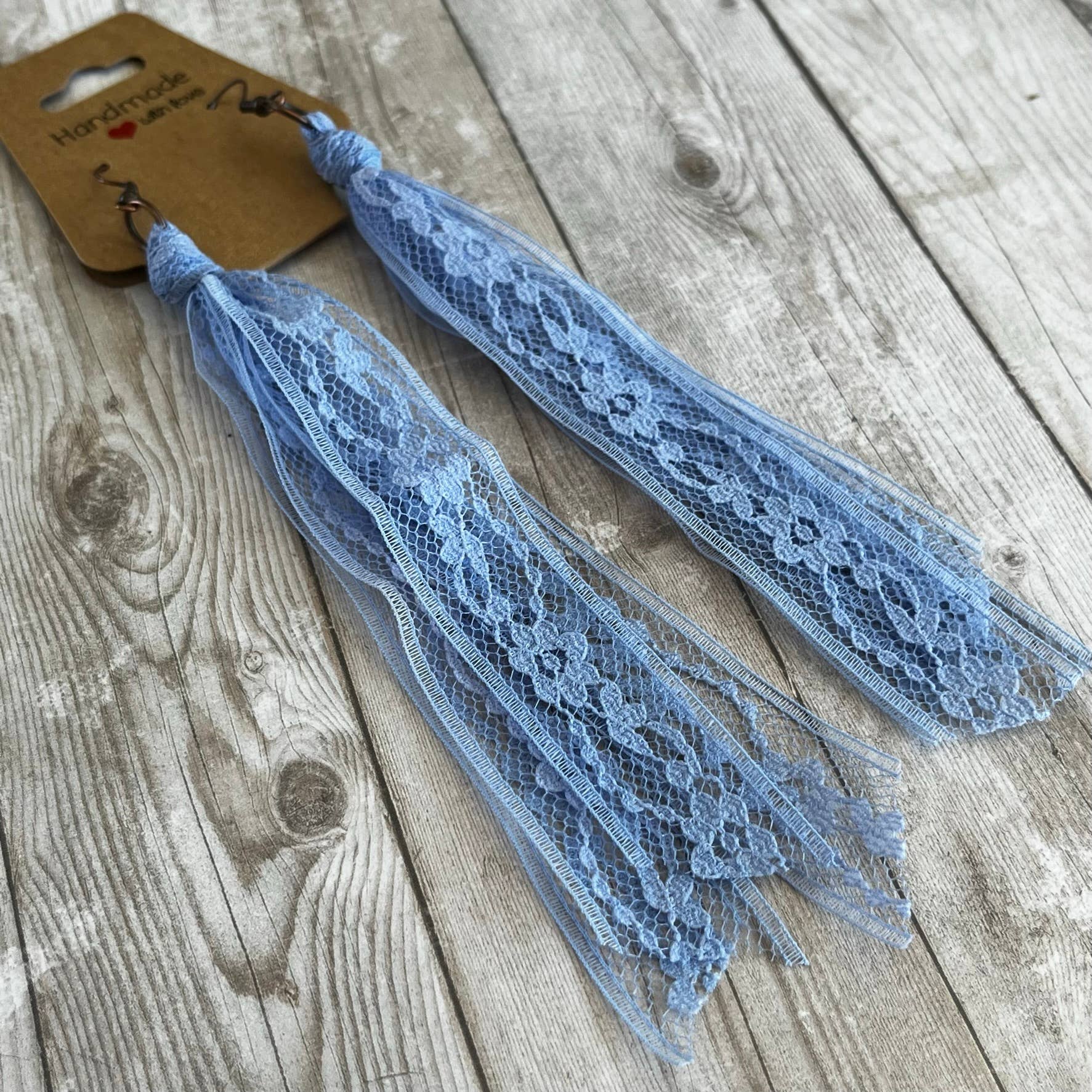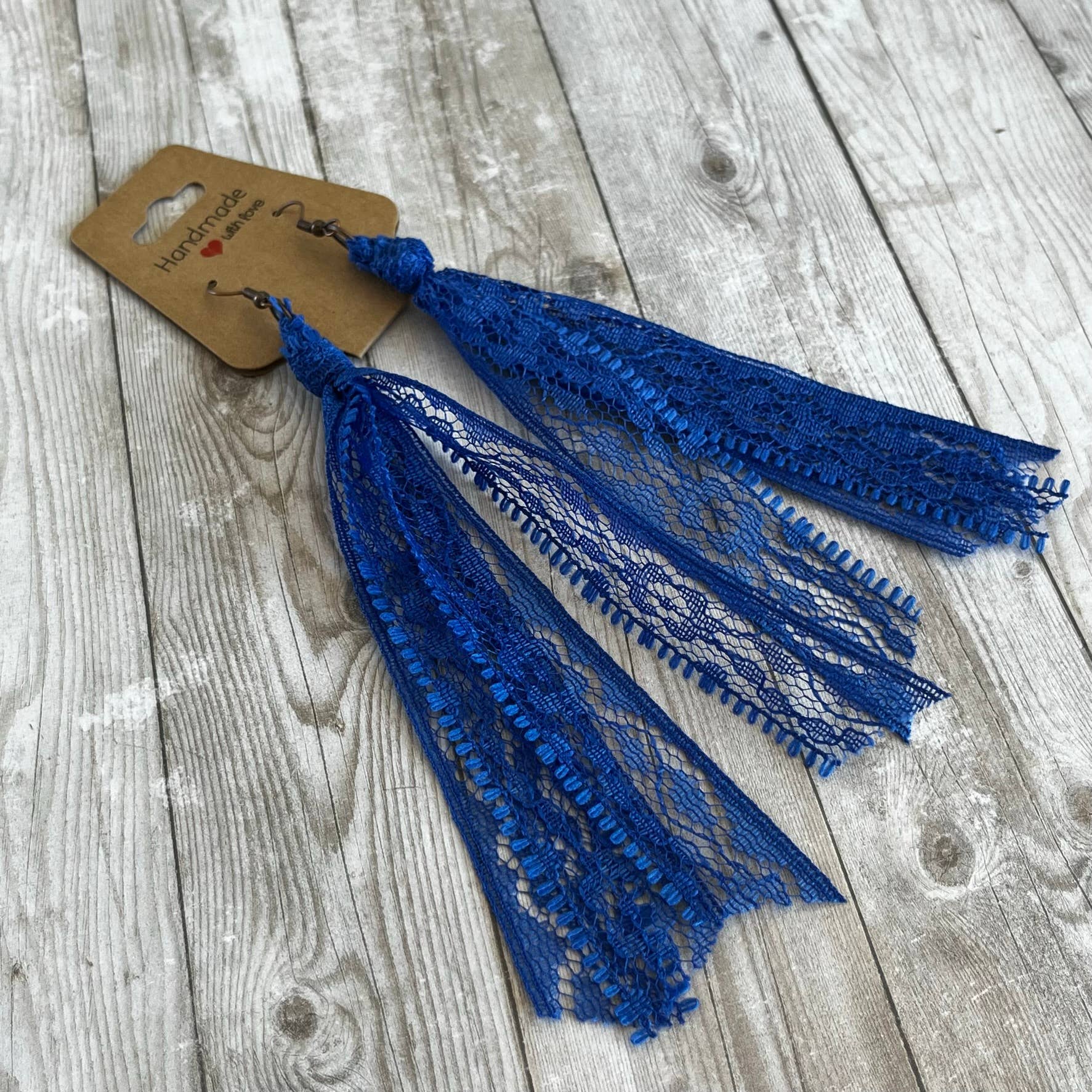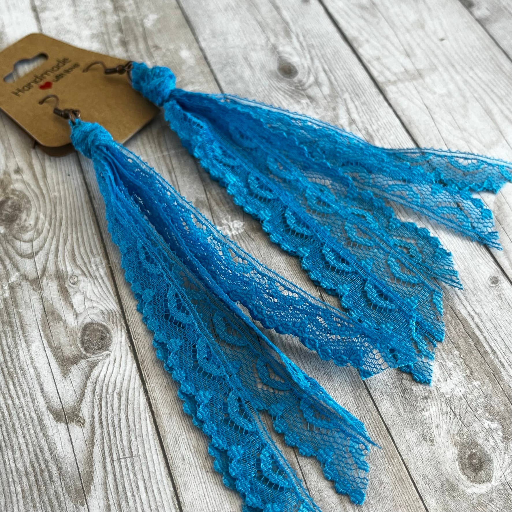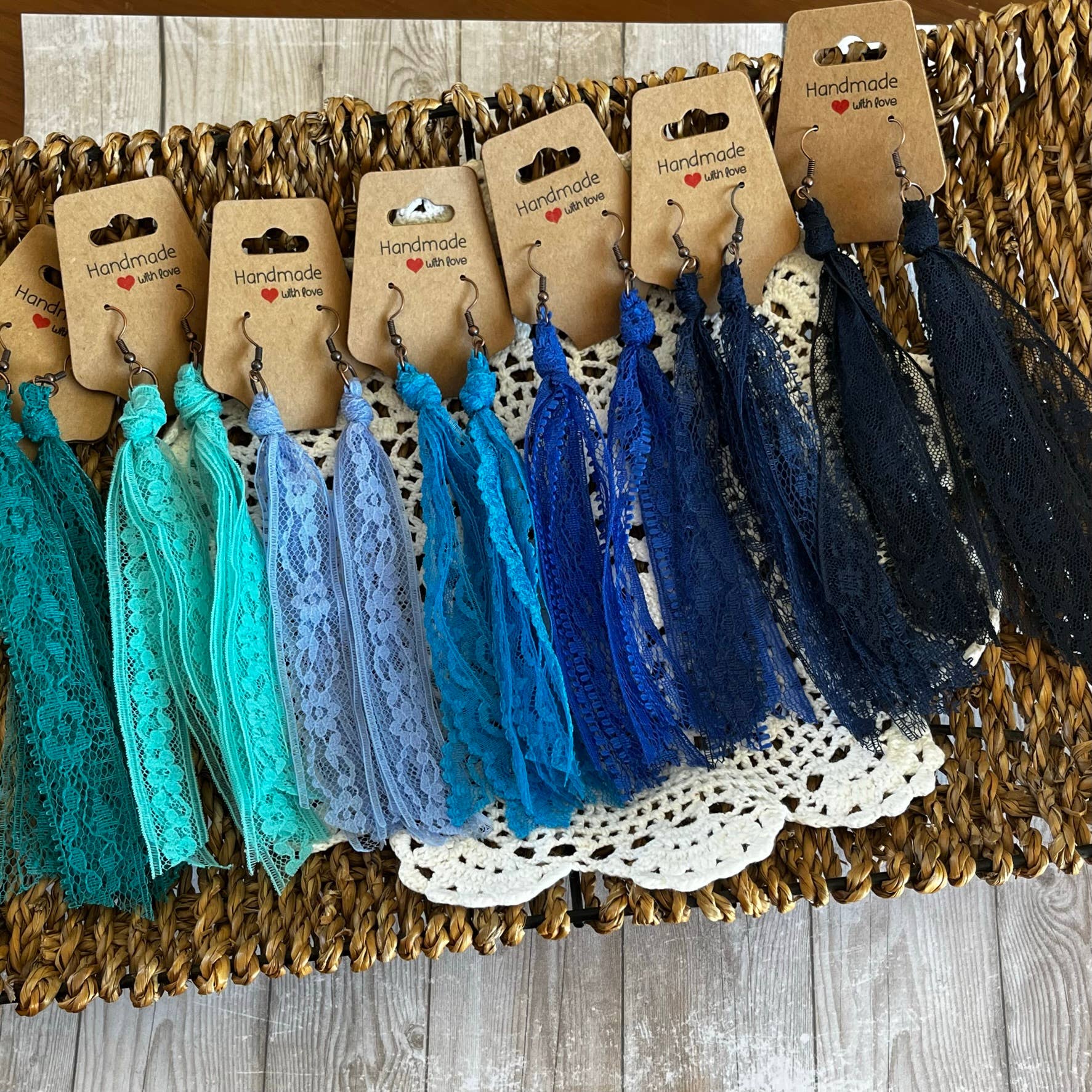 This group of lace earrings feature all of the blue solid colors . Handcrafted from my extensive collection of vintage lace. These earrings are my number one wholesale product line. They really go with so many popular styles, western, cottage core, boho, ect. The tassel measures 5 inches long. Hypoallergenic ear wires in a copper or bronze tone. Includes display card. Tons of fun color varieties available. Made in the USA