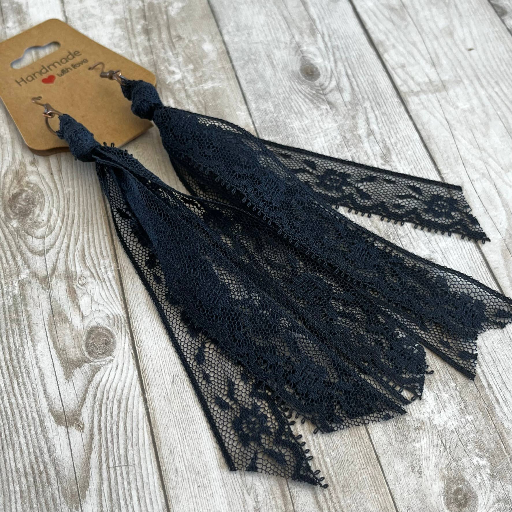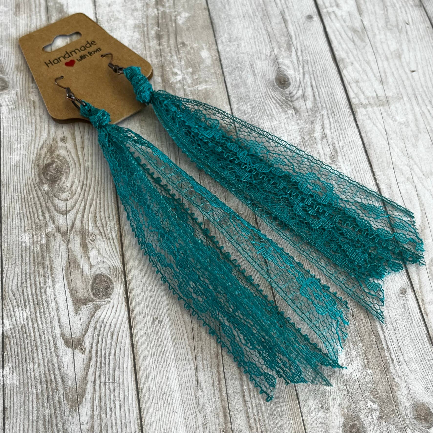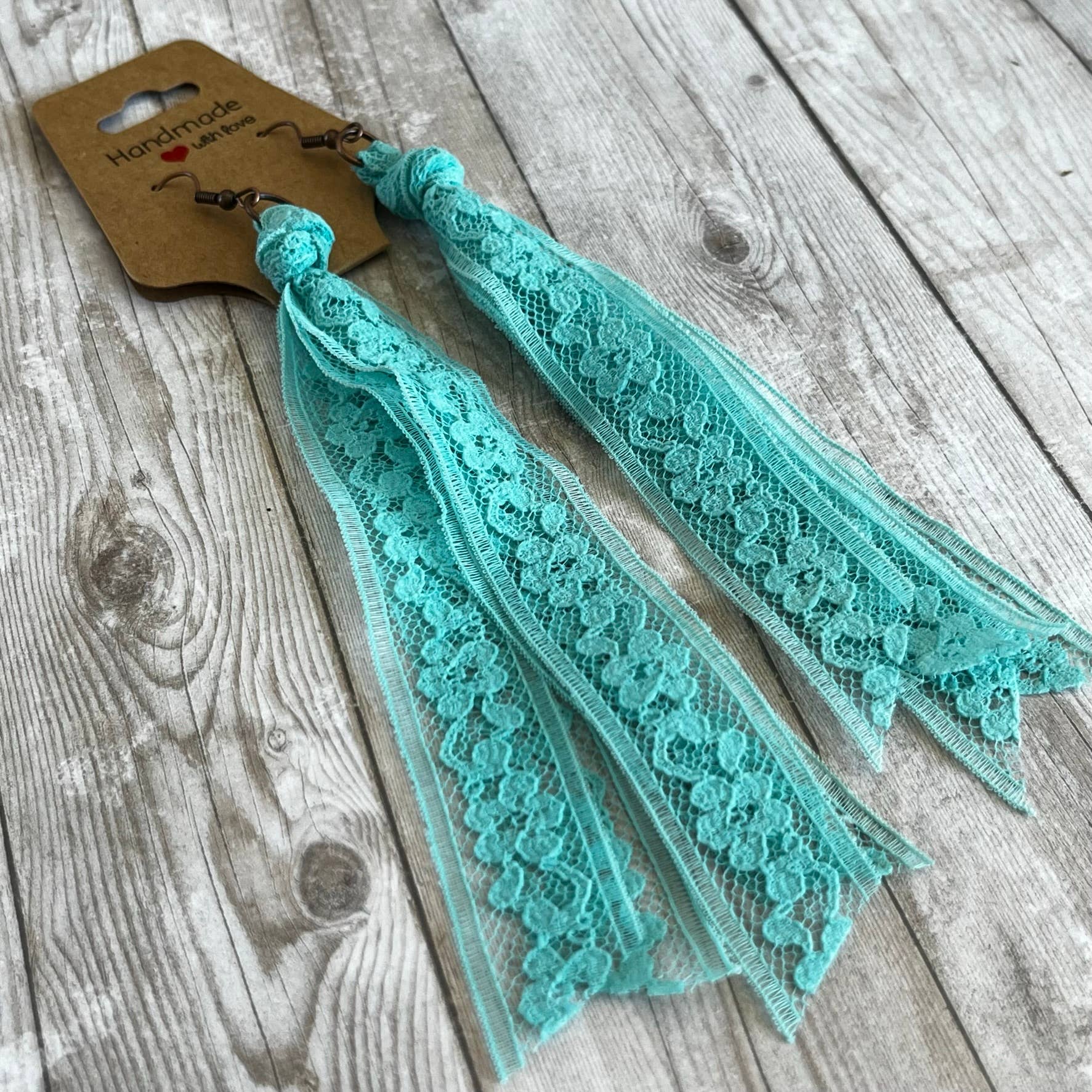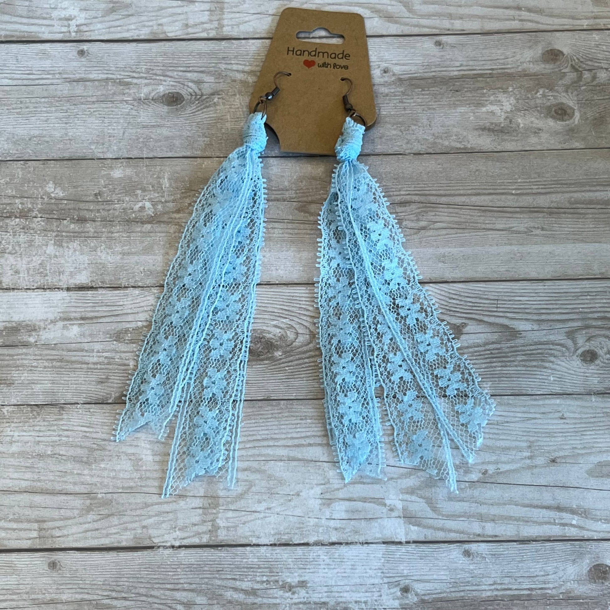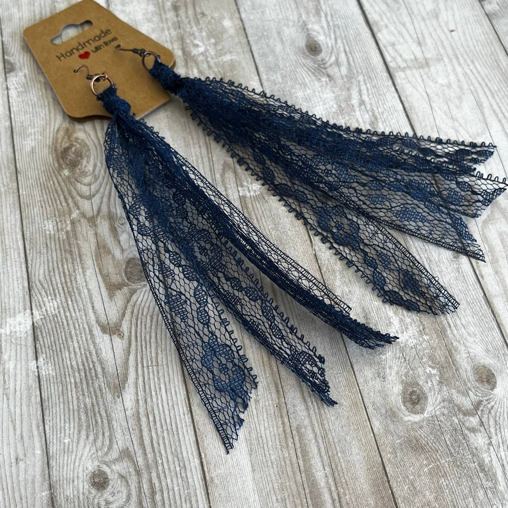 This group of lace earrings feature all of the blue solid colors . Handcrafted from my extensive collection of vintage lace. These earrings are my number one wholesale product line. They really go with so many popular styles, western, cottage core, boho, ect. The tassel measures 5 inches long. Hypoallergenic ear wires in a copper or bronze tone. Includes display card. Tons of fun color varieties available. Made in the USA