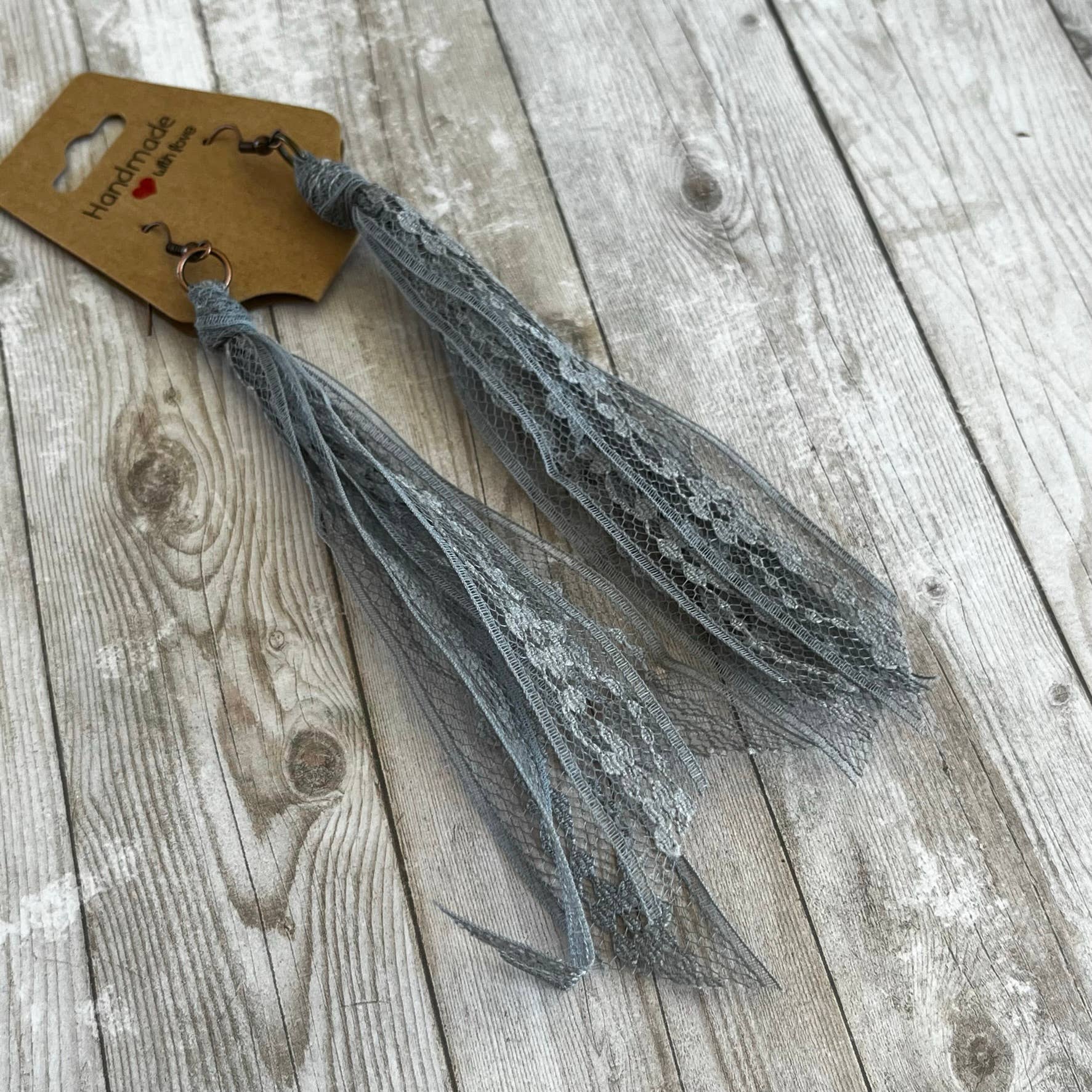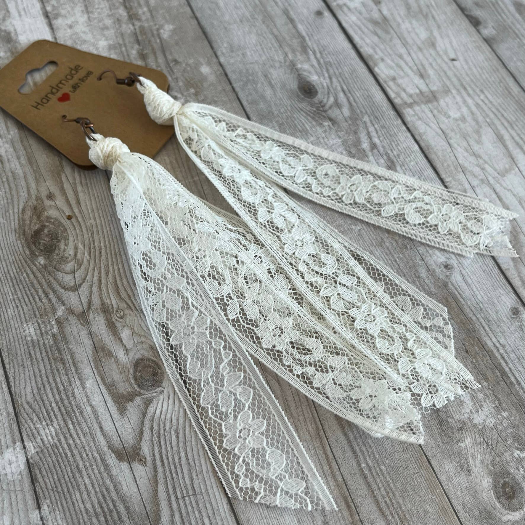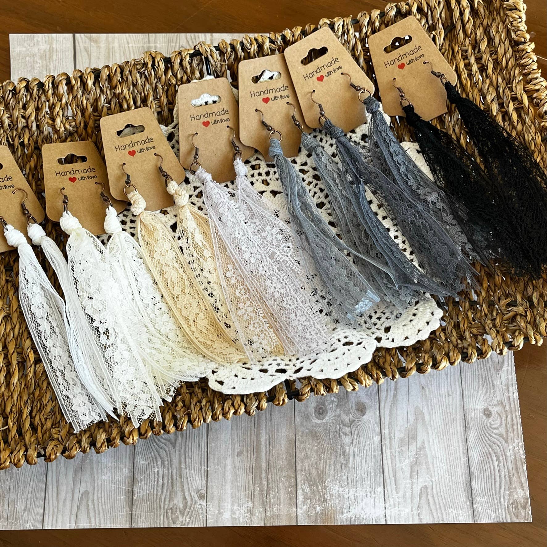 This collection of lace earrings includes all the solid neutral colors. Handcrafted from my extensive collection of vintage lace. These earrings are my number one wholesale product line. They really go with so many popular styles, western, cottage core, boho, ect. The tassel measures 5 inches long. Hypoallergenic ear wires in a copper or bronze tone. Includes display card. Tons of fun color varieties available. Made in the USA.